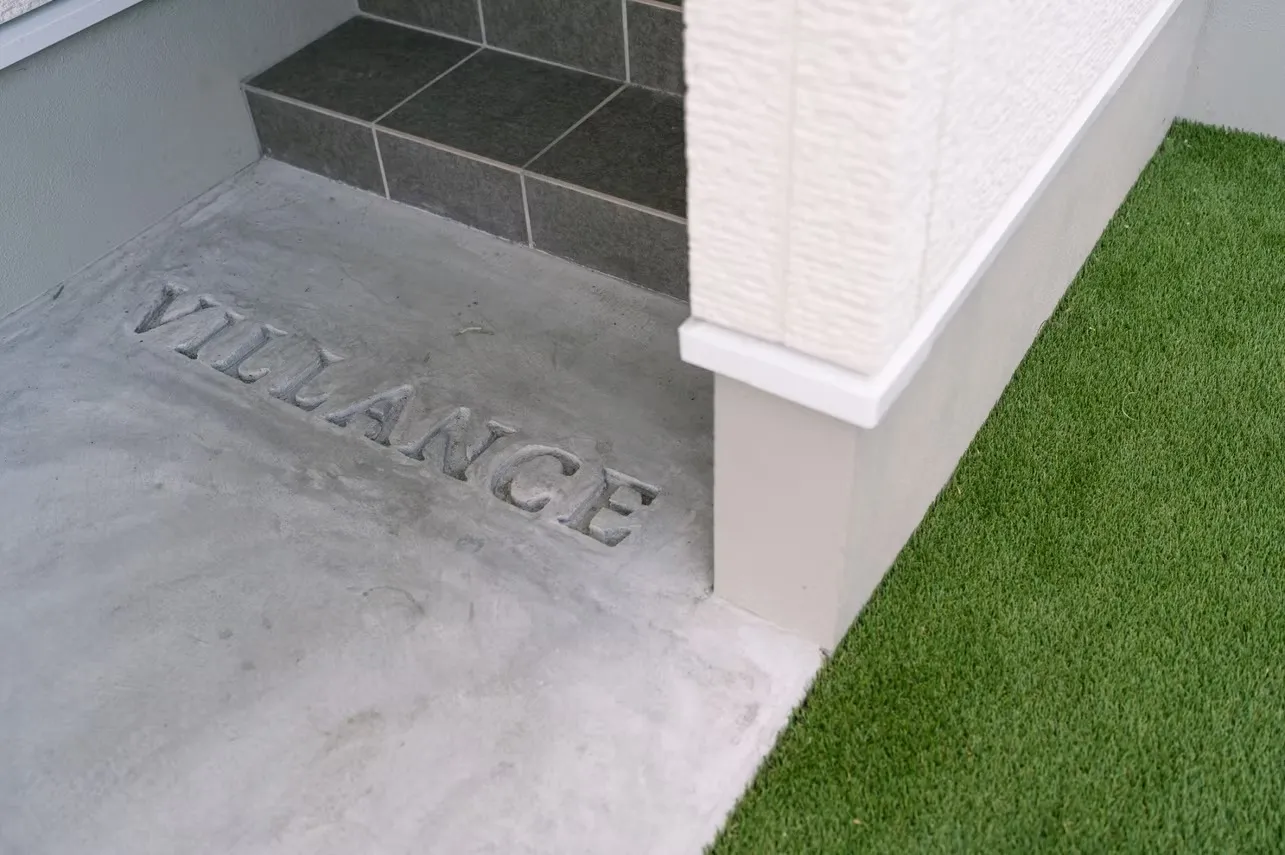 ヴィランス淡路島の玄関には、シンボルである**「VILLANCE」の文字が深く掘り込まれています**。