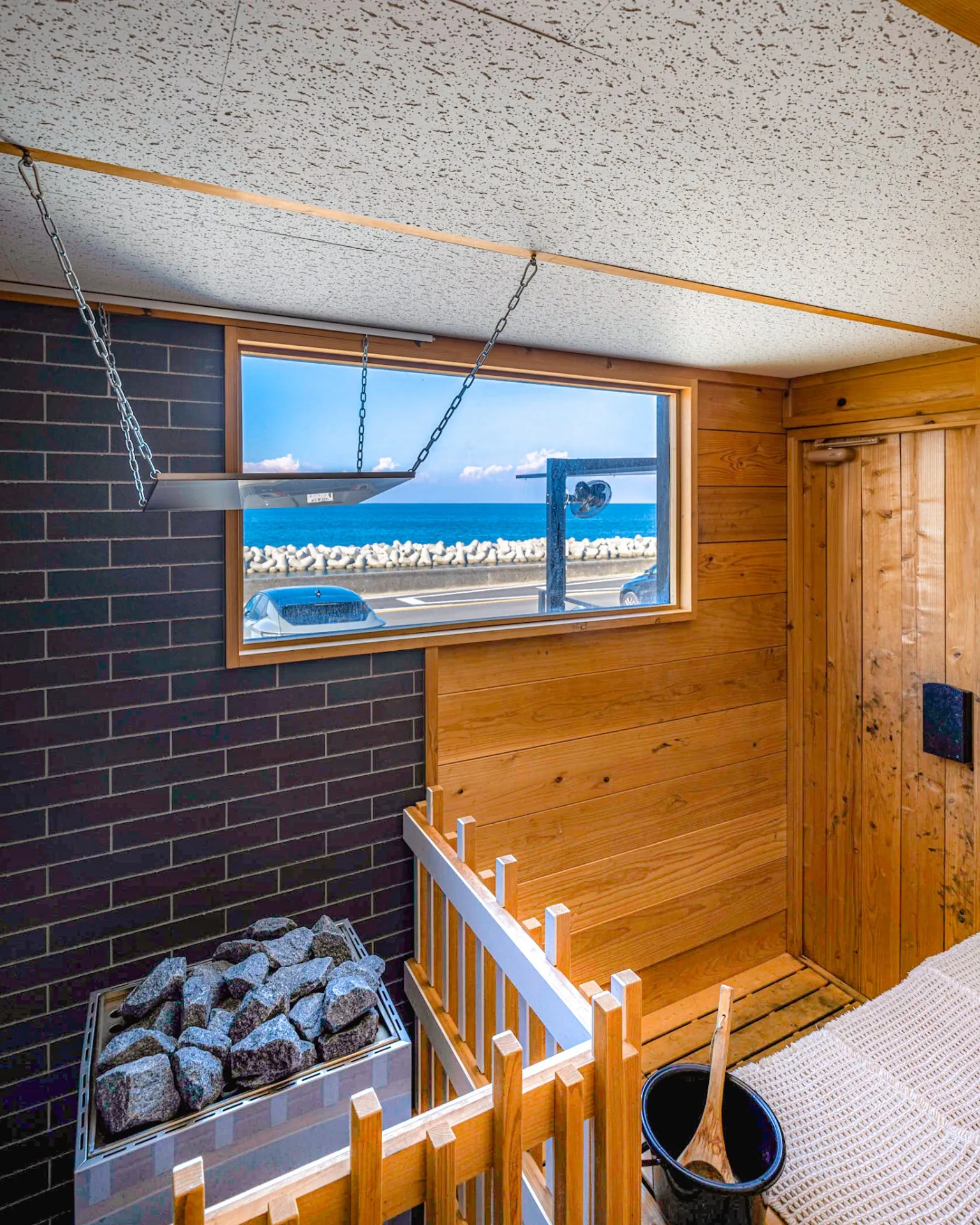 絶景を独り占め: 由良の穏やかな海を一望できる大きな窓も、この広々とした空間に設けられています。横たわりながら、海と一体になる感覚を味わうのは、この上ない贅沢です。