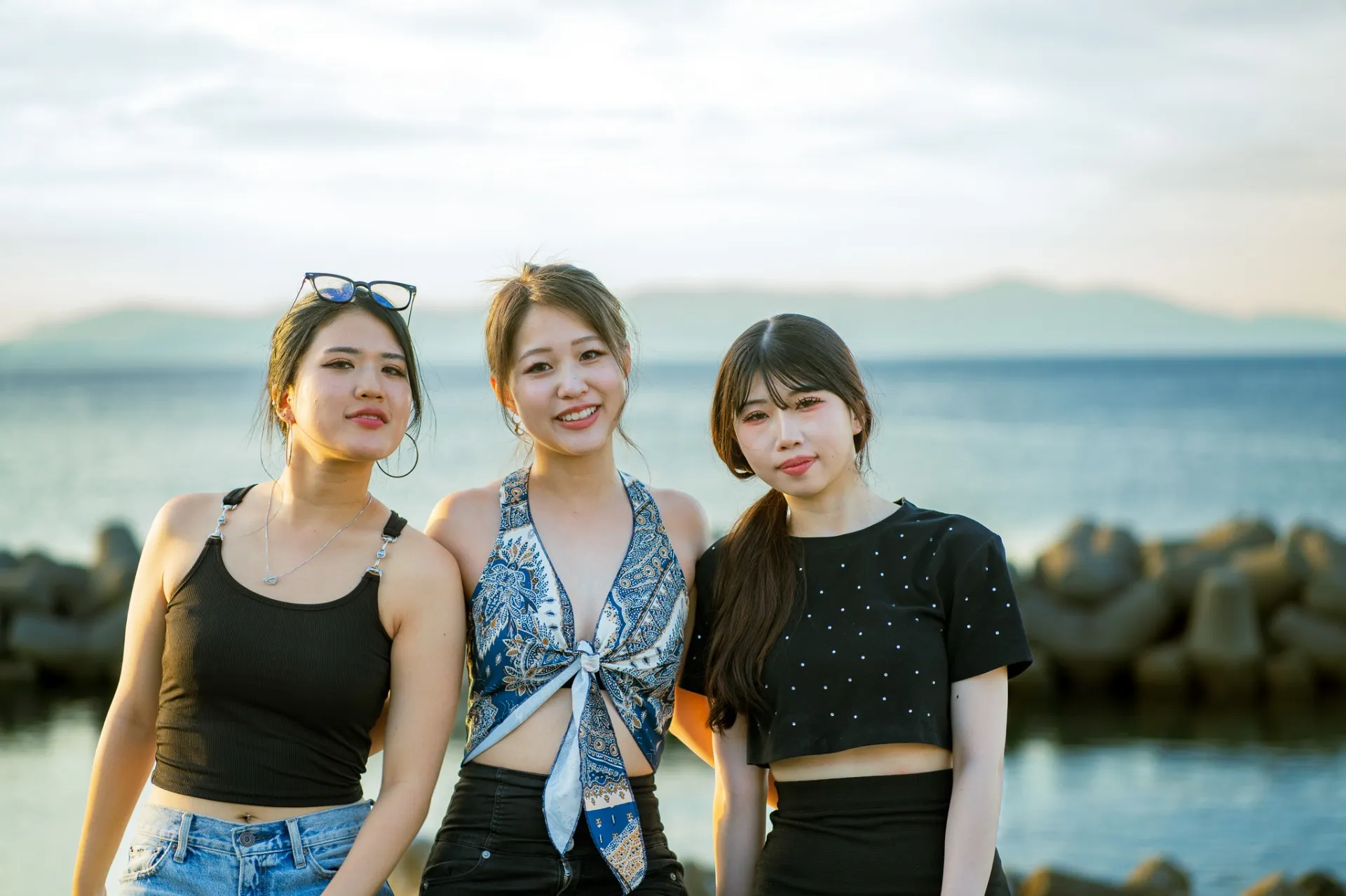 日中: 青い海と空のコントラストが、写真に明るさと爽やかさを与え、女子旅の活発な雰囲気を演出します。